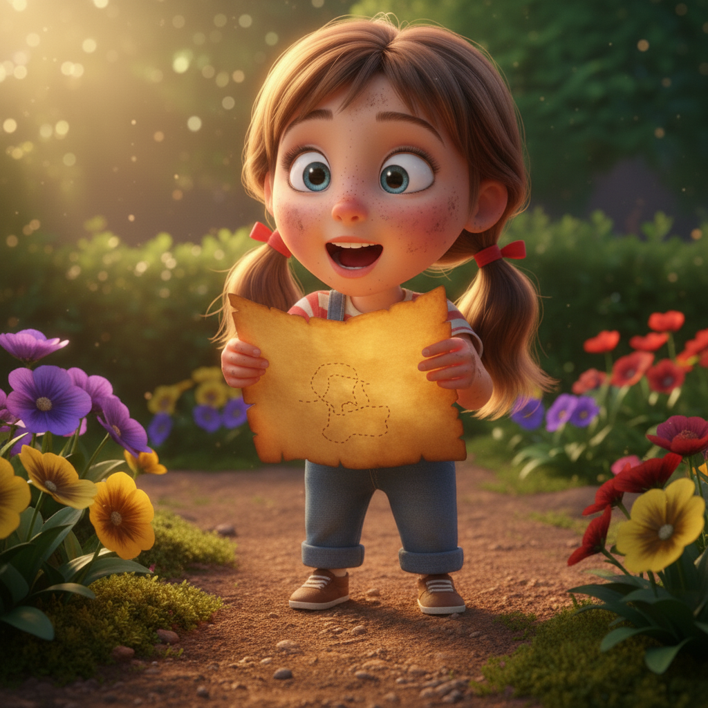 Mila is playing in Grandma's garden. She finds an old map. There is a red cross on the map. It's a treasure map!