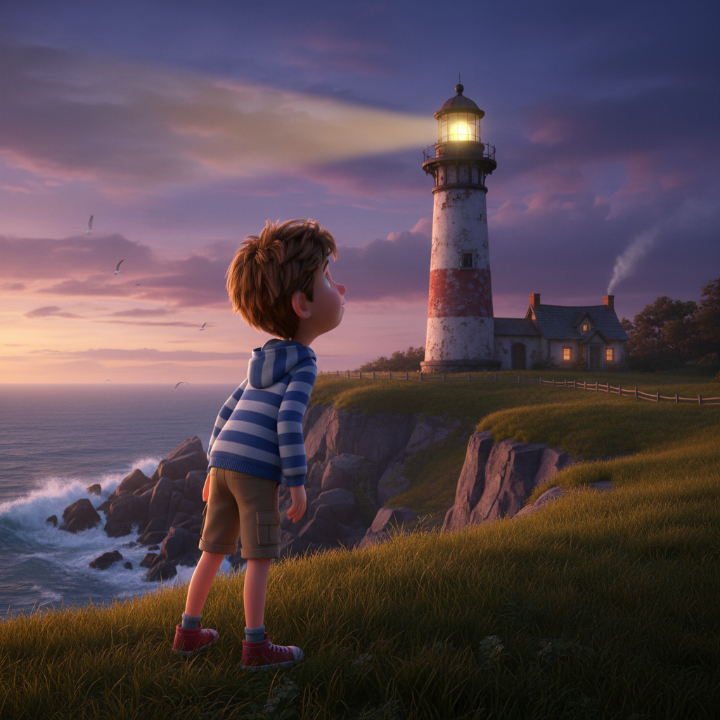 Every evening, he looks at the old lighthouse on the cliff.