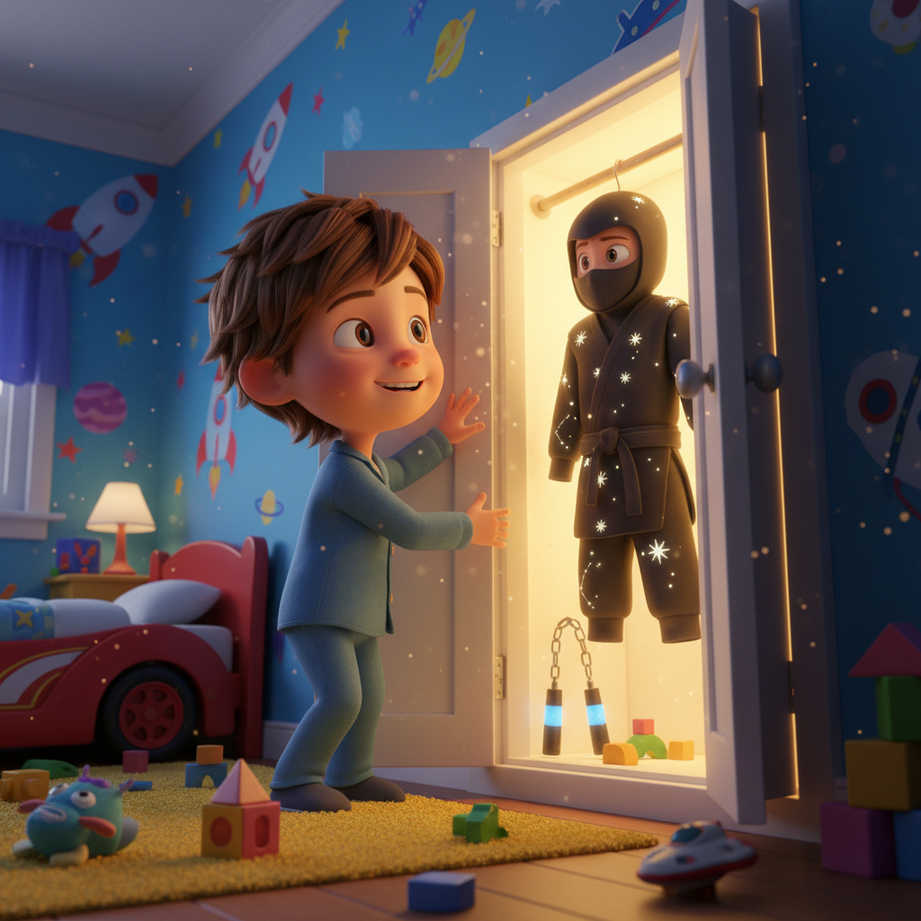 Baptiste opens his secret closet. Inside is his ninja costume! An all-black suit with a ninja mask over his face. There are also glow-in-the-dark ninja stars and a belt with lots of gadgets.