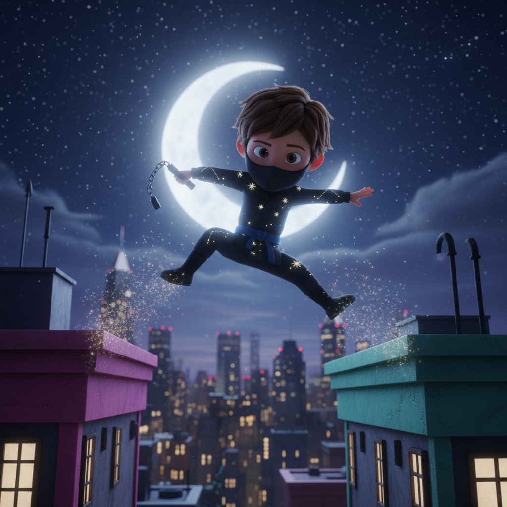 So every night, when everyone is asleep, Mega Ninja climbs out of the window and jumps from rooftop to rooftop in the city. He secretly helps people!