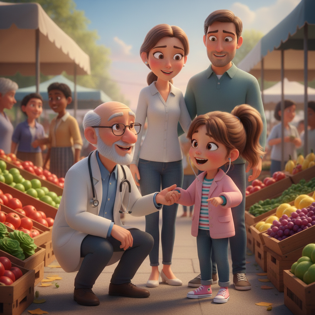 One Saturday morning, while accompanying her mother to the market, Camille spotted Dr. Laurent, their family doctor, buying vegetables. Without thinking, she let go of her mother's hand and ran towards him.