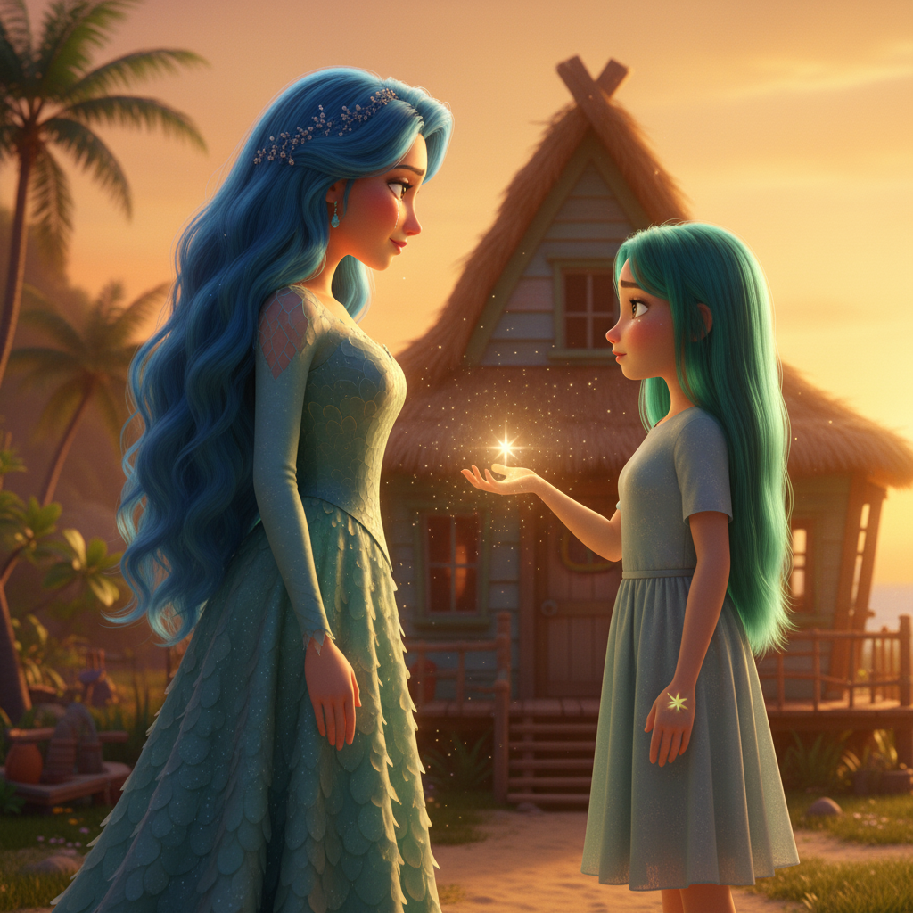 Then, three days ago, everything changed. A woman appeared in front of our house at sunset. Tall, majestic, dressed in a gown that seemed woven from sea foam and moonlight, with hair the same emerald hue as mine, but even longer, cascading to her feet like a living river. Her skin had a pearly sheen, and her eyes... her eyes were such a deep blue they were like the ocean itself.
