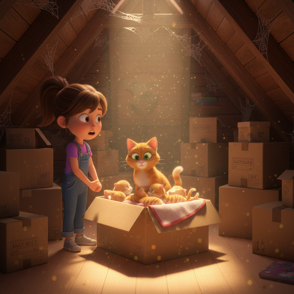 Behind a large cardboard box, they discovered their cat... who wasn't alone! Snuggled against its warm belly, four tiny kittens were sleeping peacefully. They were so small, with their eyes still closed.