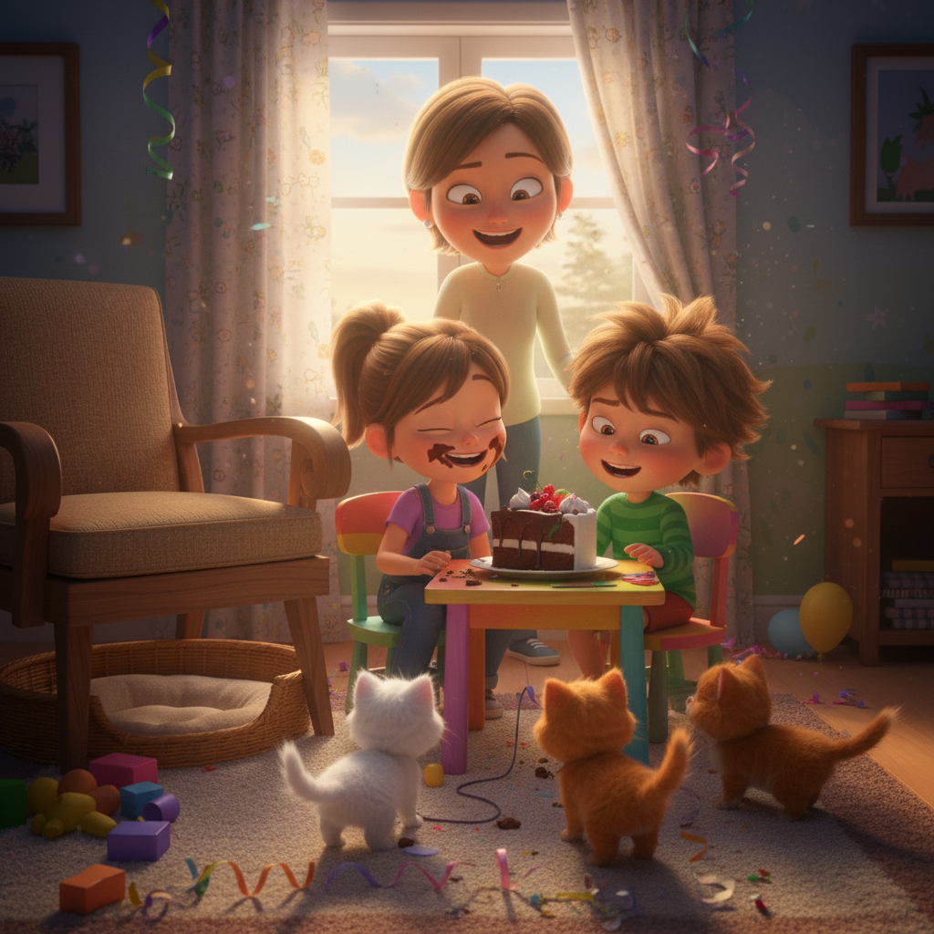 And when Mom served them a huge slice of chocolate cake, they shared it equally, under the tender gaze of Pistachio and her four little ones: Feather, Vanilla, Hazelnut and Caramel.