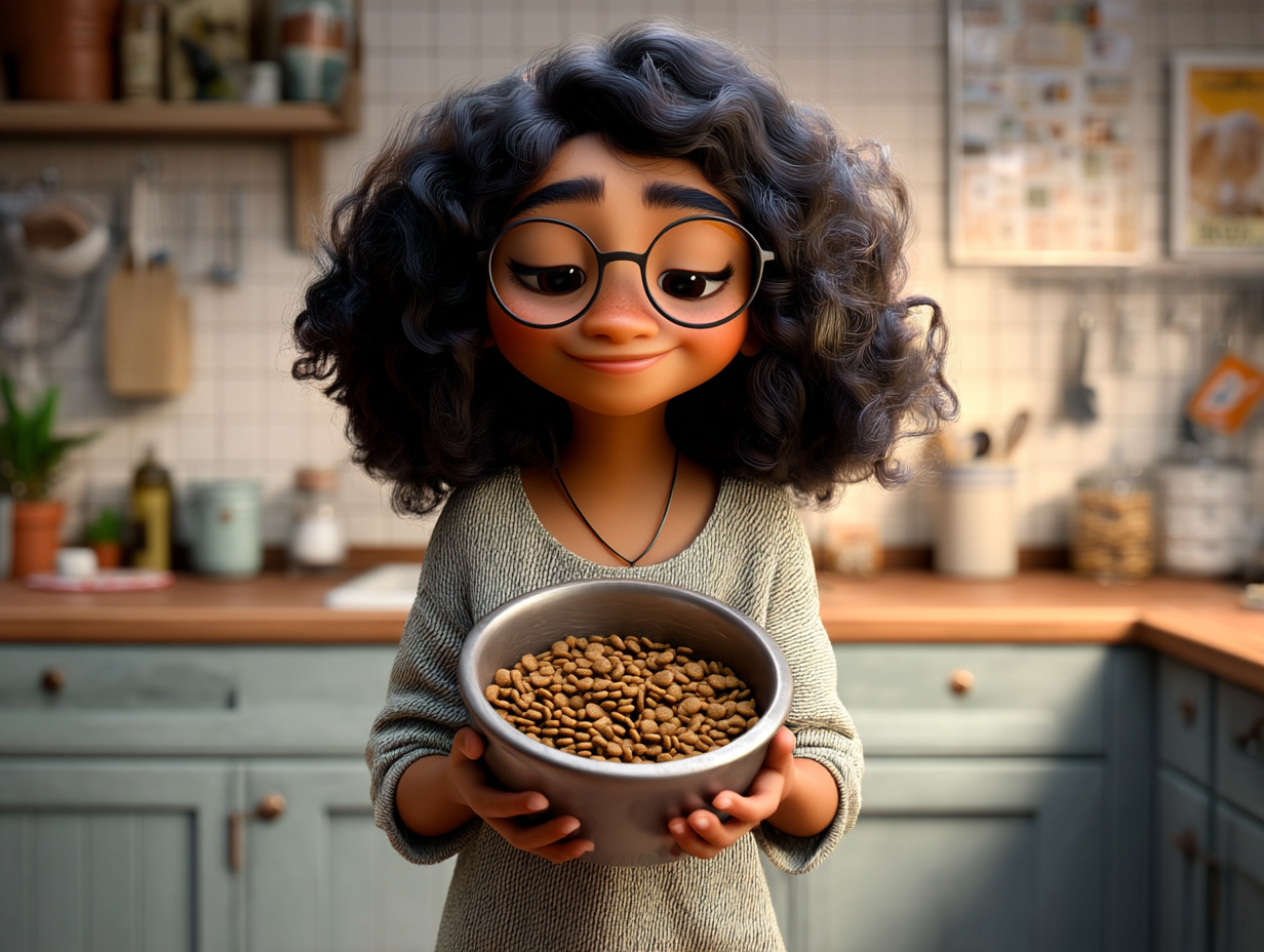 She immediately runs down the stairs four at a time and hurries to conscientiously serve Moka's bowl, who is patiently waiting for her in the kitchen, happily wagging his tail when he sees her arrive with his bag of kibble, clearly delighted that dinner is finally coming.