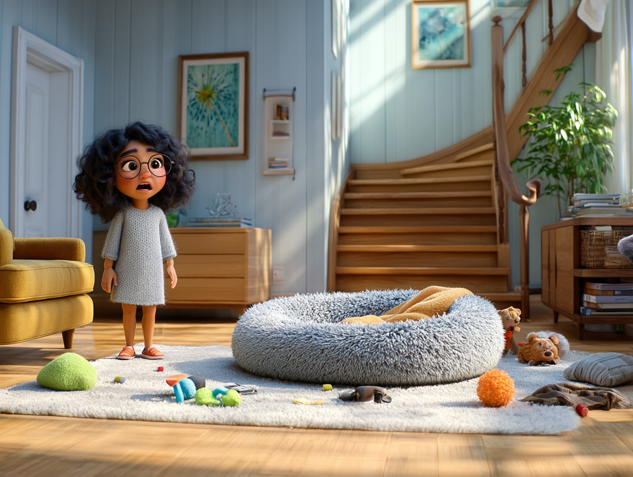 Her radiant smile vanished instantly. Her eyes widened in surprise. Moka's basket was overturned. Her toys were scattered all over the room. And... was that a corner of the rug that had been chewed?
