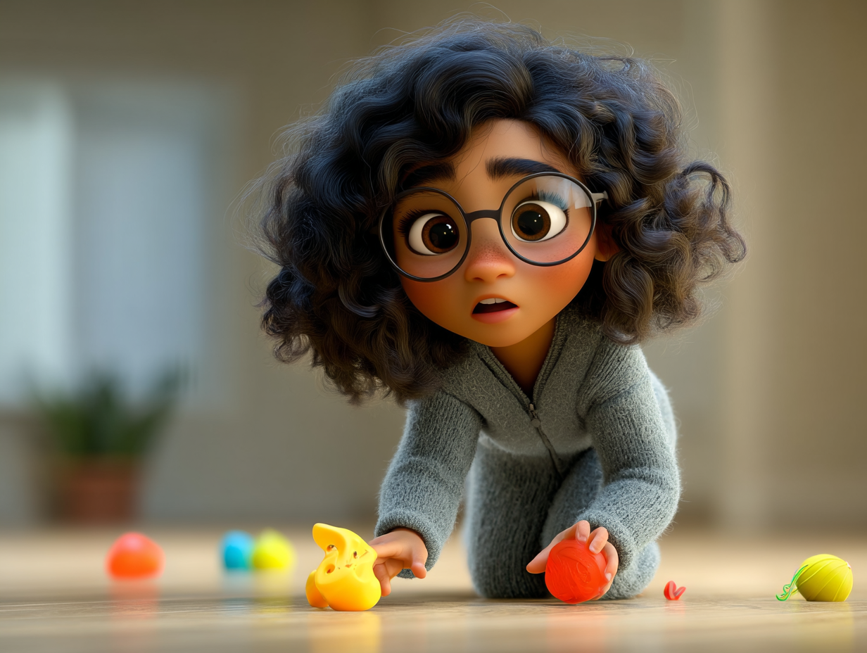 Zoé methodically begins to gather the scattered toys, placing them one by one back into the basket, which she then straightens. She smooths the rug as best she can, mentally noting that it may need to be repaired later.