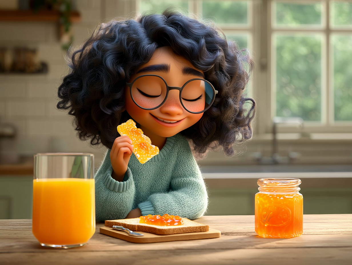 She goes into the kitchen, thinking Moka can wait. Zoé pours herself a glass of orange juice, spreads butter on a slice of bread, adds jam, and sits down at the table. She eats peacefully, already thinking about the games she'll play with Moka: walks in the park, ball games, maybe teaching her to sit or give her paw.