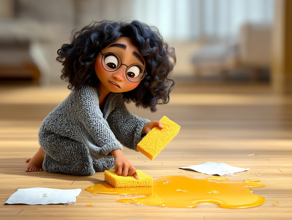 She places her forgotten slice of toast on the living room table, fetches paper towels and a sponge from the kitchen, fills a bucket with soapy water, and gets to work diligently and seriously. She carefully wipes up the puddle, meticulously cleans the parquet floor, going over and over it again until everything is perfectly clean and there is no visible trace or lingering odor.