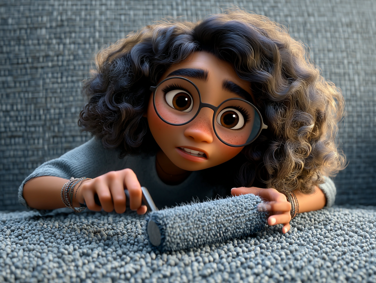 Zoé methodically prepares herself like a true cleaning professional, gathering all the necessary tools. She begins energetically and diligently by rolling the pet hair roller over the entire surface of the sofa. The hairs stick instantly to the roller's adhesive surface; it's almost satisfying and mesmerizing to see how effectively this simple tool works!