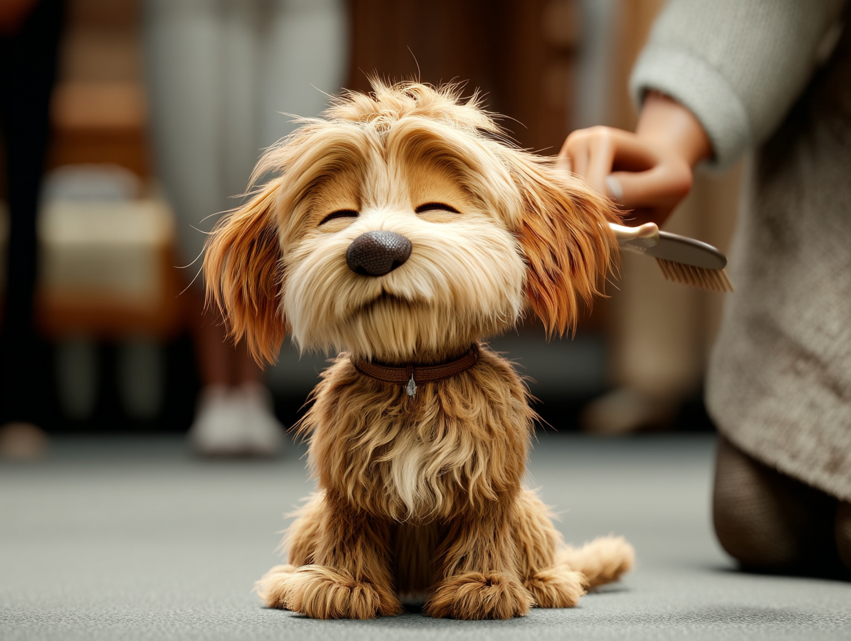 She gently begins to brush his light brown fur. At first, Moka shifts a little, unsure of what's happening. But after a few steady strokes of the brush, he closes his eyes and relaxes completely, clearly delighted by this special attention.