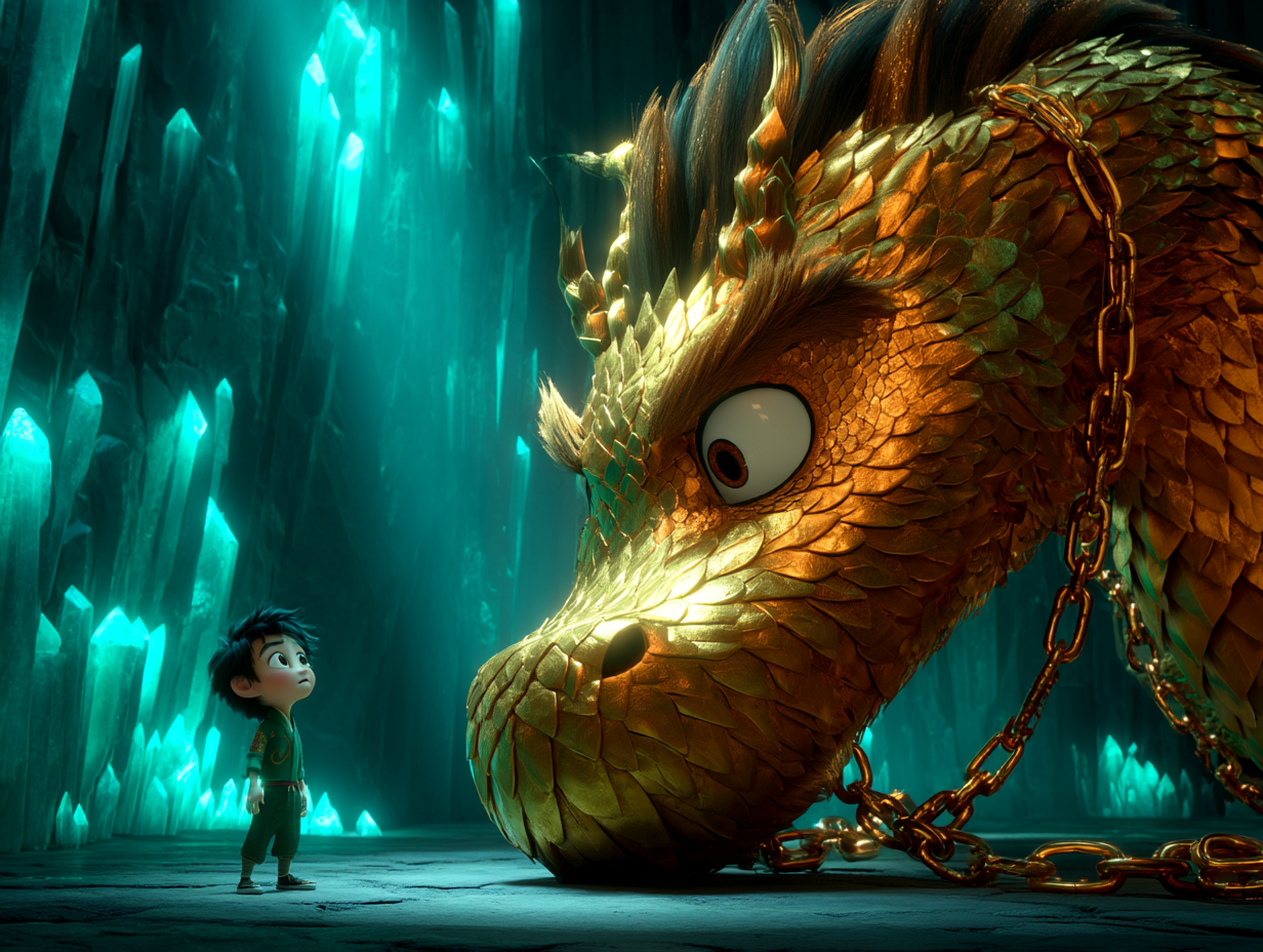 Tao approaches, his heart pounding. Then he understands why the dragon isn't moving. Shining crystal chains surround it, holding it prisoner.