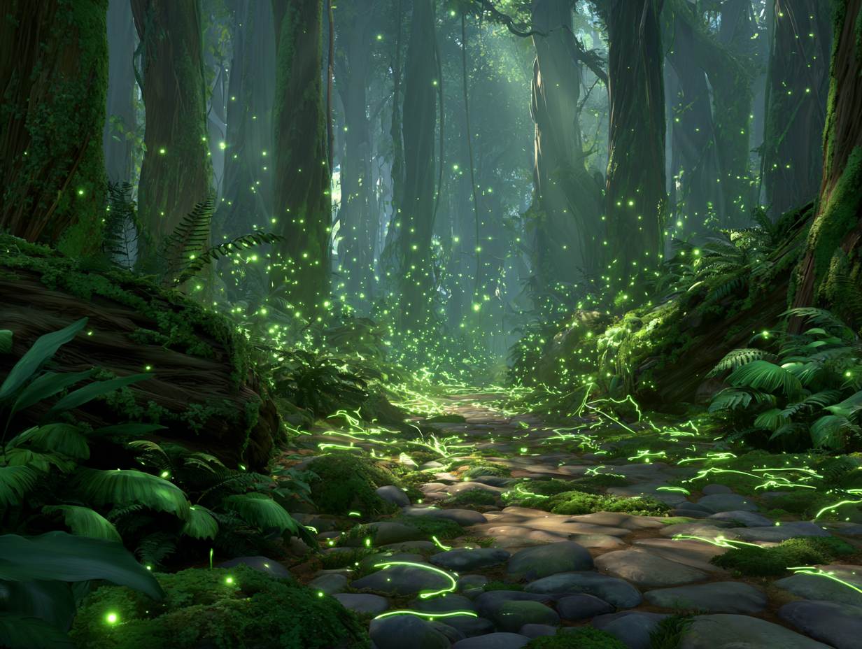 Suddenly, before them, between the immense trees, a path appeared. It hadn't been there a moment before. It was a path of green light that pulsed gently, rhythmically, like the beating of a living heart.