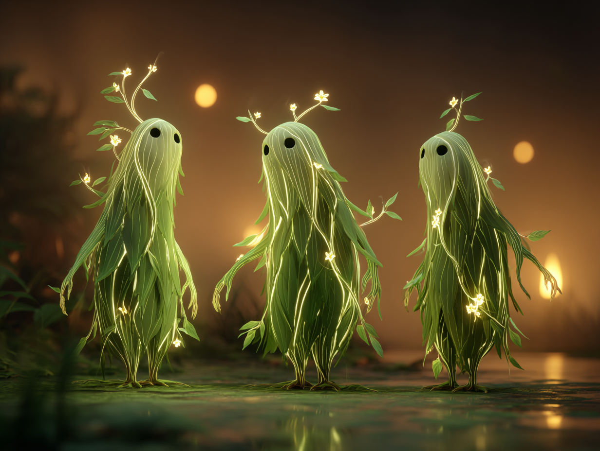 They are the guardians of the forest. Nature spirits in their purest form. They vaguely resemble human beings, but their bodies are composed of green light intertwined with leaves, branches, and flowers. Their faces are serene, almost expressionless, but their eyes—if they can be called eyes—shine with an ancient and profound intelligence.
