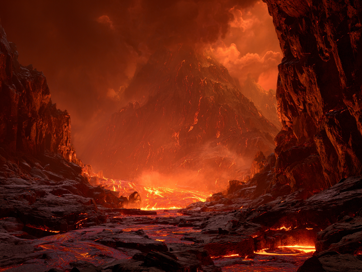 The volcano's interior is a world of fire and molten rock. The heat is indescribable—intense enough to kill a normal human in minutes. The air is thick with smoke and sulfurous steam. Rivers of orange and red lava flow down the walls, creating a terrifying, dancing light. The constant roar of fire echoes everywhere.