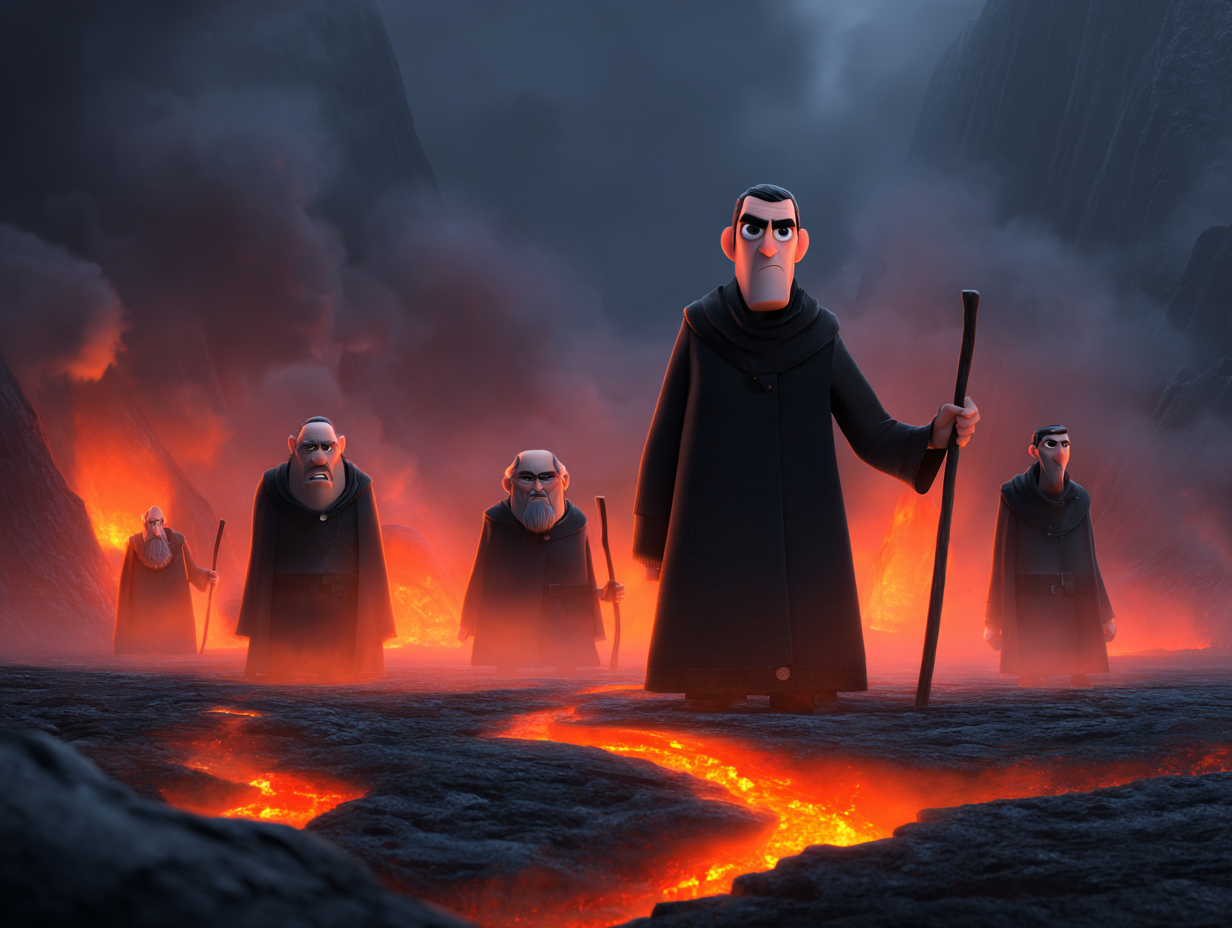 Six men dressed in black robes stand before the volcano's main entrance—a large fissure in the mountainside from which a constant red glow emanates. These men look different from the previous ones. More trained. More dangerous. They carry fighting sticks and have hard, determined expressions.