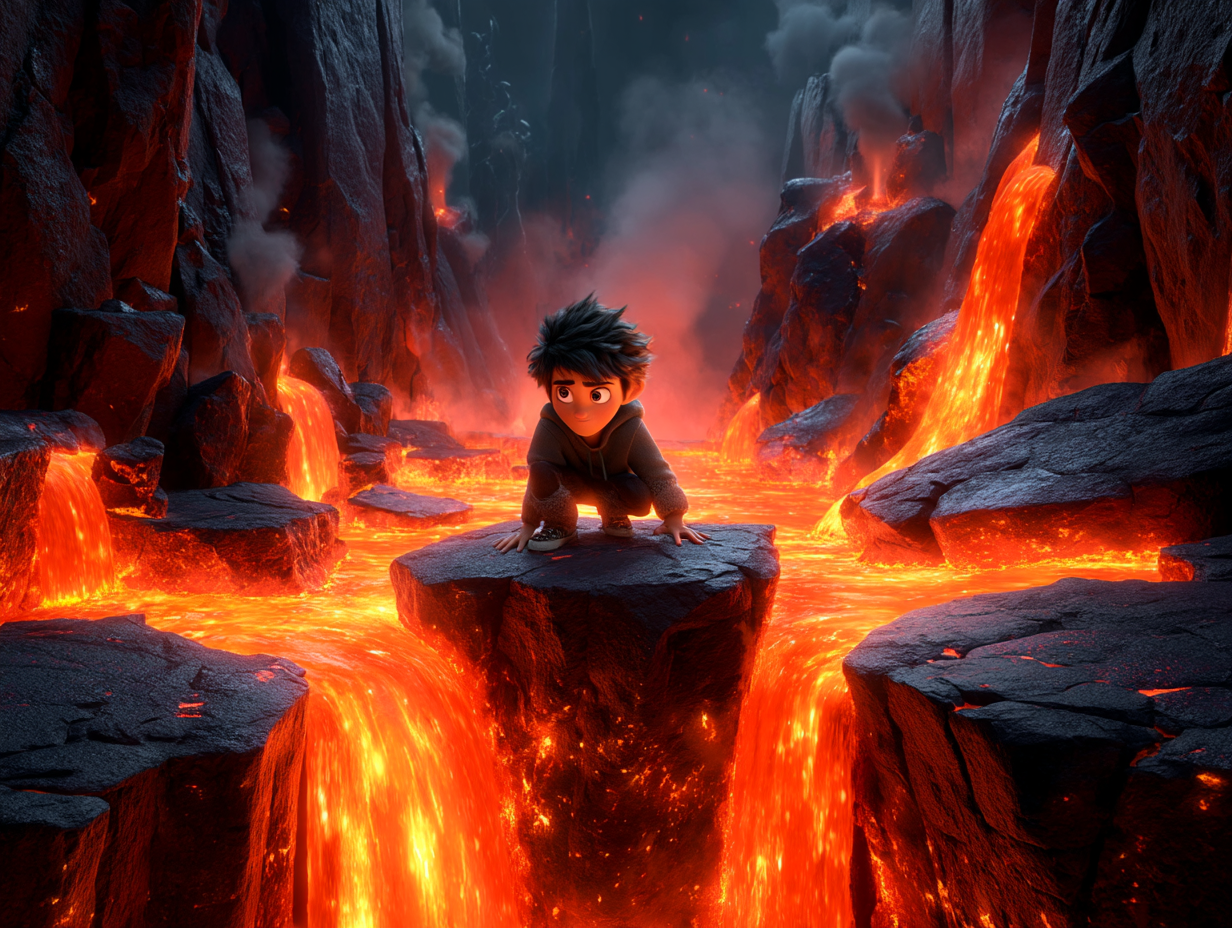 Finally, after what seemed like hours and minutes, he arrived at a massive magma chamber in the very heart of the volcano. It was a colossal cavern, its walls pulsing with flowing lava. At its center was a lake of boiling lava, glowing with an intense orange that hurt the eyes.