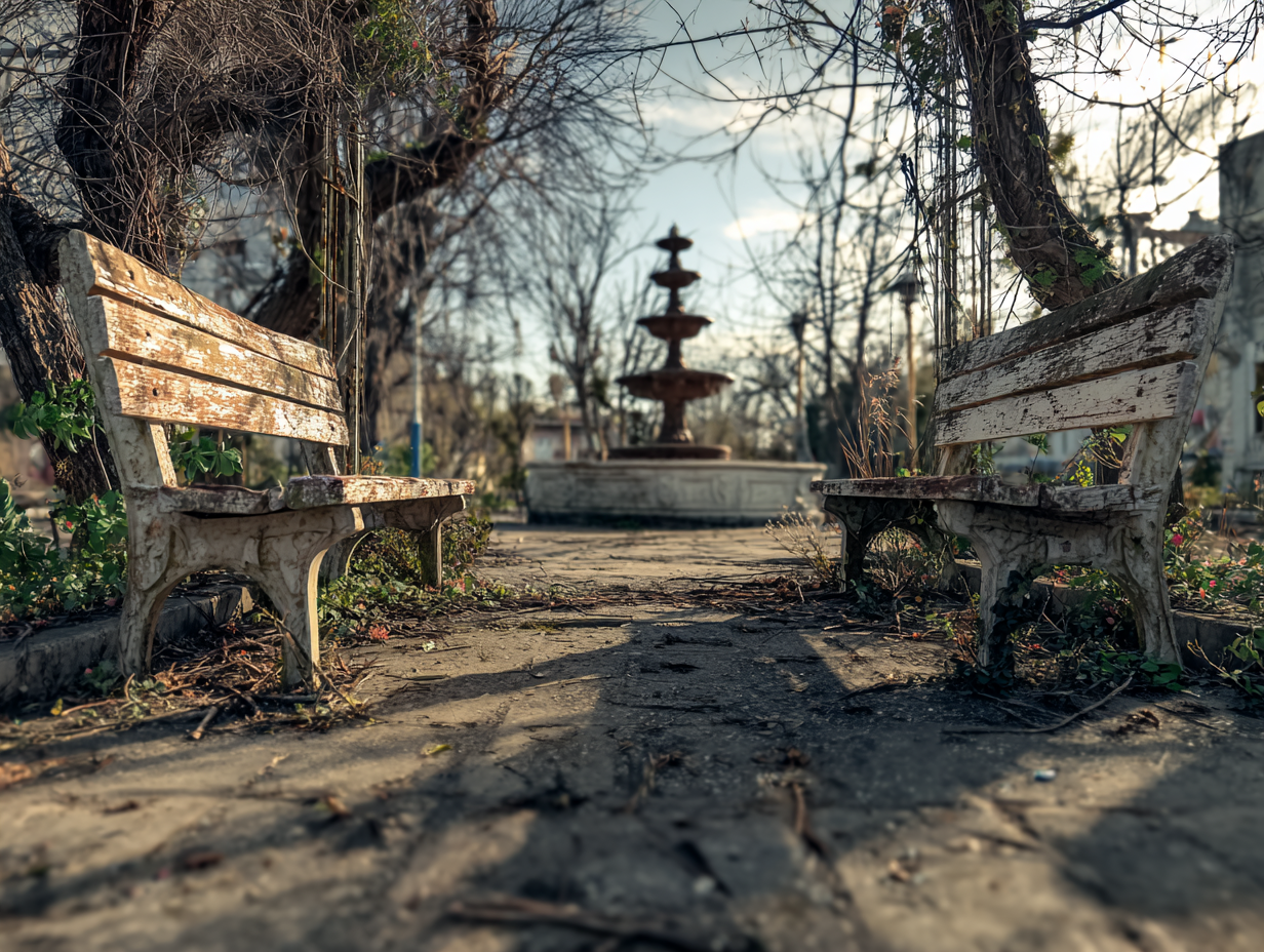 That same evening, Camille went to scout the area, discreetly taking her notebook and magic paints to the park. When she arrived, she discovered a truly sad and completely silent place. The benches were deeply cracked, the trees were completely dry, and the ground was entirely littered with dead branches and debris.