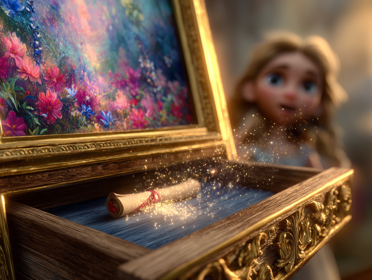 A faint creak could be heard, almost imperceptible. Camille jumped. The frame had just moved slightly! She gently placed her hand on the bottom edge of the frame and felt a mechanism release. A small wooden panel slid to the side with a soft creak, revealing a secret compartment carved into the thickness of the frame.