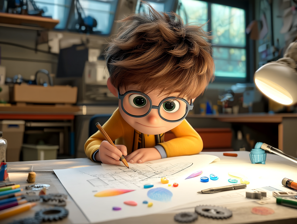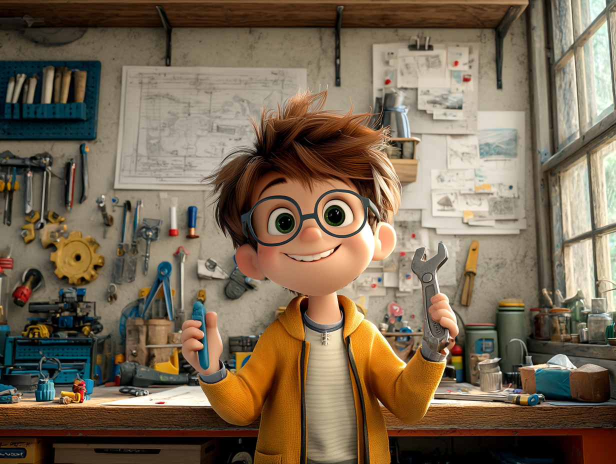 Jules loves inventing, tinkering, and solving problems. In his workshop, a corner of his room filled with tools, plans, and mechanical parts, he's always dreaming up incredible new machines. His brain is constantly buzzing with brilliant ideas, and he loves seeing a simple sketch on paper become a real object he can test.
