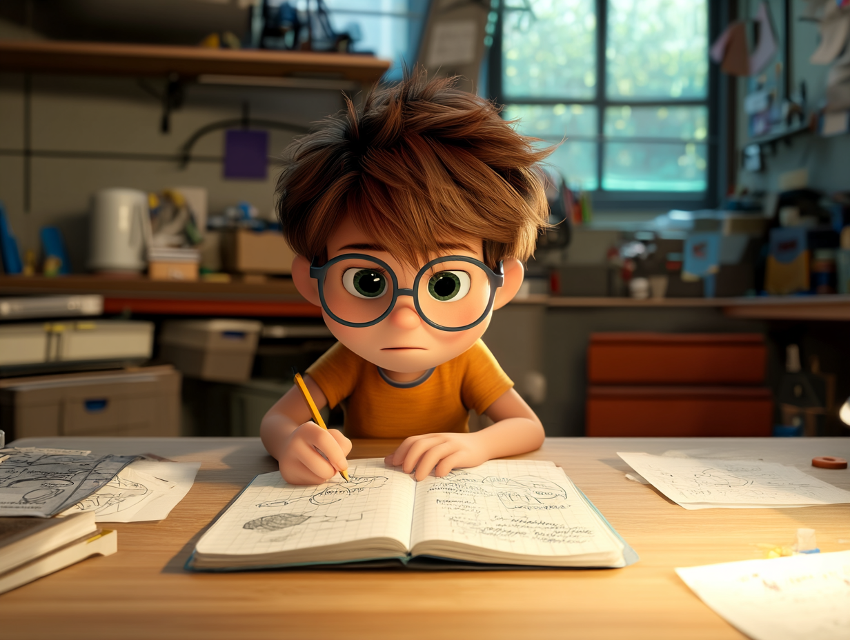 As soon as he gets home, he goes up to his room and writes down his ideas in his inventor's notebook: