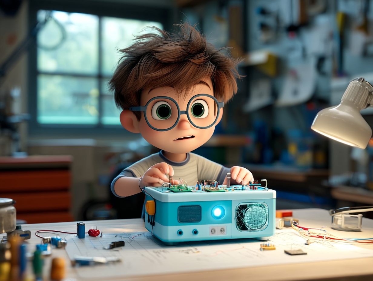 He spends the whole afternoon assembling the parts. He connects the motion sensor to the circuit board. He attaches the speaker inside the box. He solders some wires with his dad's help. He tests each connection to make sure everything works properly.