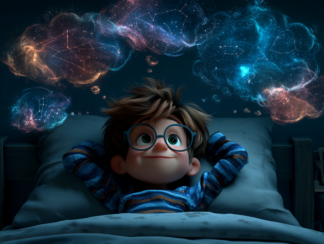 Lying in bed, he closes his eyes and focuses on his own thoughts. He imagines the starry sky, remembering his grandfather's voice explaining the constellations to him. The stars shine in his mind as they do in the sky.
