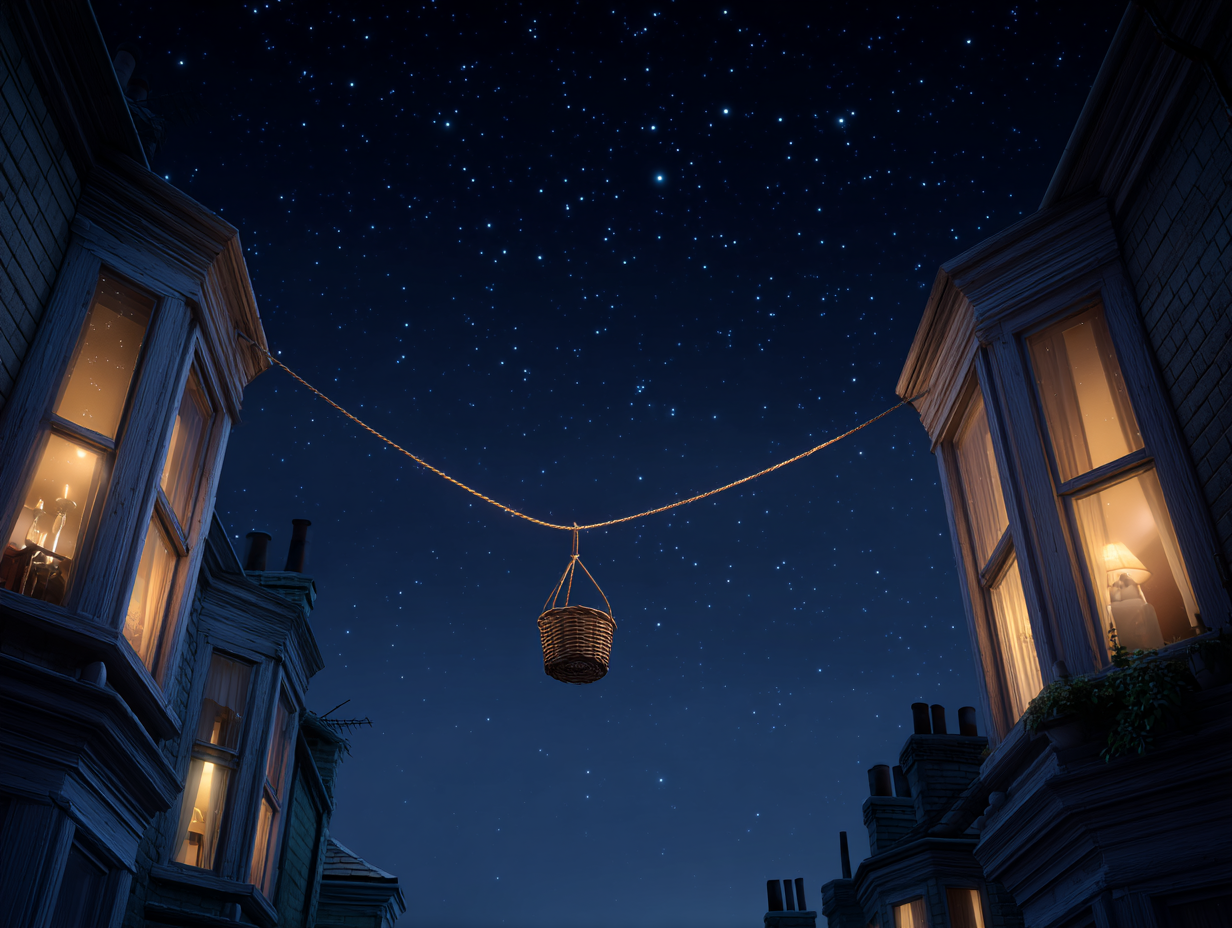 He gently pulls on the rope to send the basket to Theo's house. The small basket slowly crosses the space between the two houses, swaying lightly in the evening air.