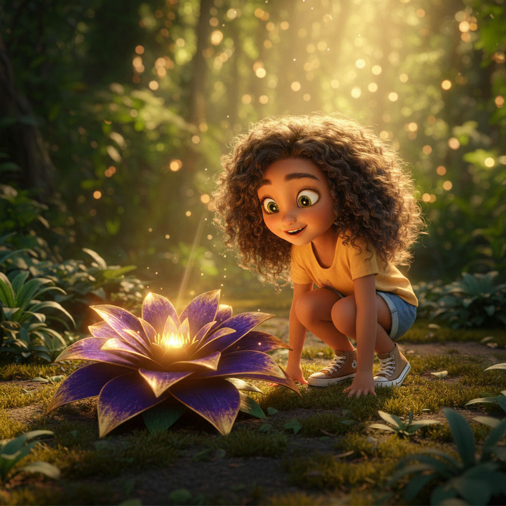 After a few minutes, Naya arrives at a small clearing she has never seen before. In the center, bathed in a ray of sunlight, is a magnificent flower.