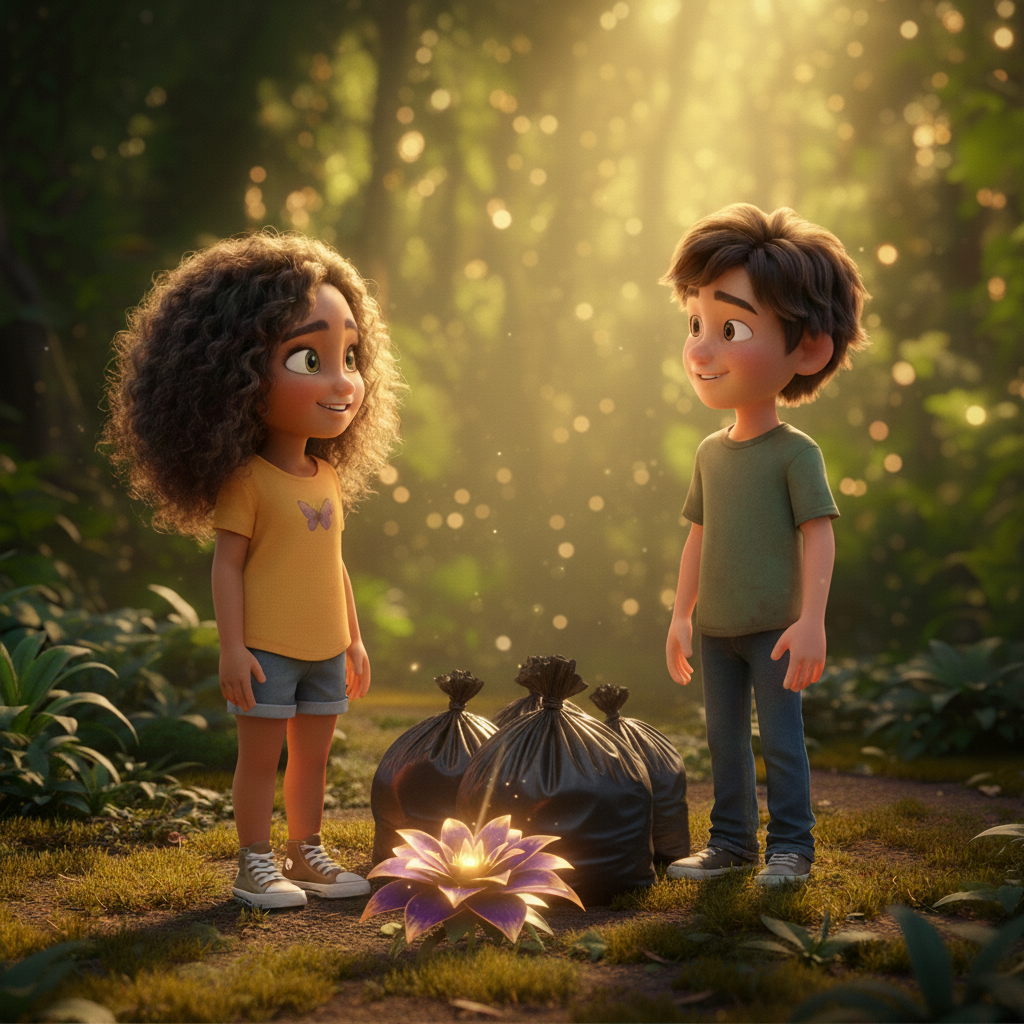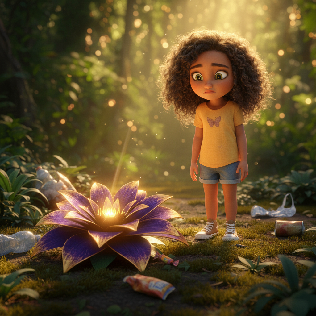 Naya sat down on the ground, exhausted but content. She looked at the purple and gold flower, which seemed to shine even brighter now that the trash around it had disappeared.