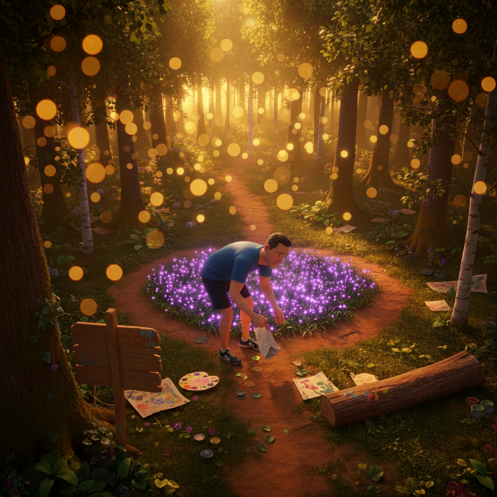 They finish cleaning the clearing, carefully picking up every piece of litter. The small purple flowers already seem a little better, now that they can breathe. Even the small, damaged flower is perking up slightly.