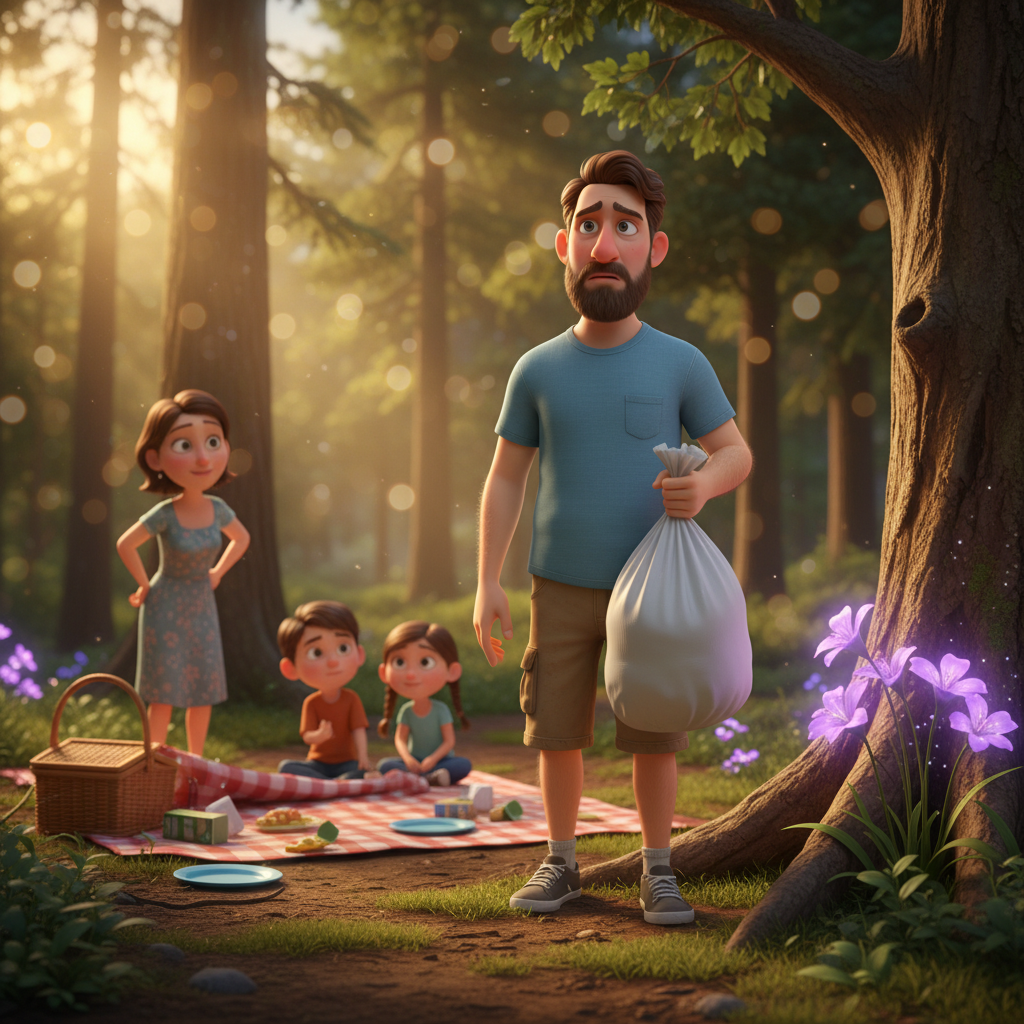 The father hesitated for a moment, holding the bag of rubbish in his hand. Then, with a sigh, he placed it at the foot of a tree.