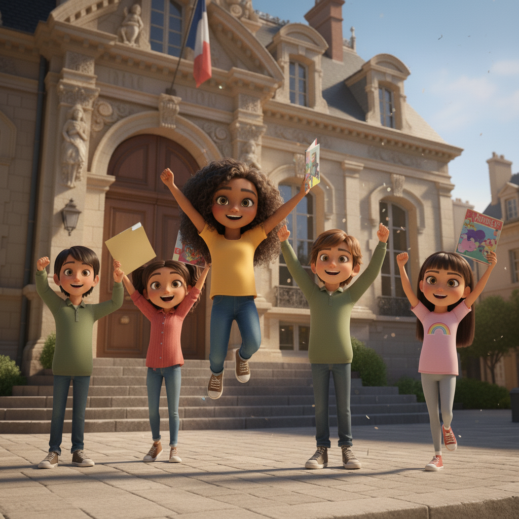 The children burst with joy. Léa and Emma hug each other. Malik and Tom high-five. Naya feels tears streaming down her cheeks, but this time, they are tears of happiness.